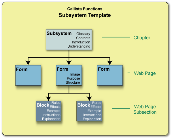 In the diagram above, a Subsystem is presented as a chapter of the manual, a form is presented as a web page and a block is presented as a subsection of a web page.