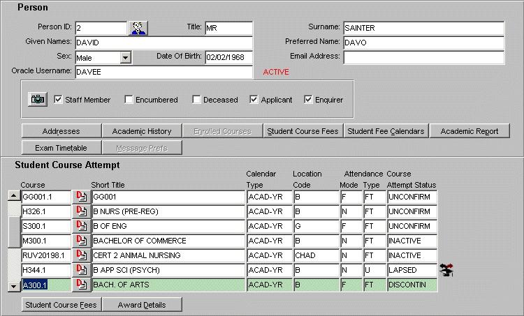 Academic History Button - Clicking on the button displays further details of all the student's course attempts in the Student Course Attempt screen.