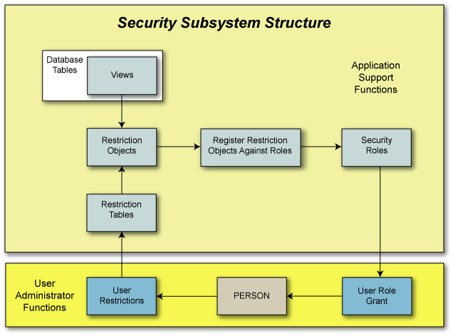 This diagram illustrates how the various components of the security Subsystem interact to create an individual's security profile.