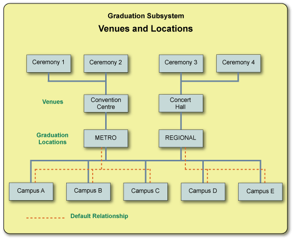 Each Graduation Ceremony is held at a specified venue. Each venue is associated with a single nominal 'Graduation Location'. A campus location can be associated with one or more Graduation Locations, but one Graduation Location must be nominated as the default for the campus. The example in the diagram below illustrates a possible structure.