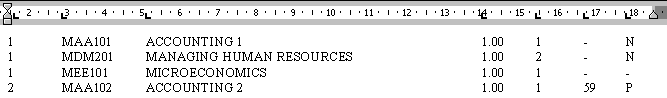 To create a Transcript Template the user is required to have Word 8.0 (Word 97) or above. Create a new Word document and save it into the directory specified in control.doc, using a name of your choosing. The template must be saved in the directory prior to creating a System Letter Definition in CORF2520. For best results design your template with Word's 'Show/Hide Paragraphs' set to 'Show'. The following examples of formatting Letter Parameters for transcript in the template are meant as a guide only. In the following examples, Letter Parameters have been created with the same name as the system Letter Parameter they have been mapped to. Institution specific data configurations may cause significant variations in the formatting of Letter Parameters in Transcript Templates.