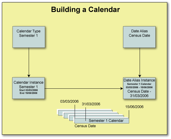 | Date Alias In the System, Date Alias is the generic name for a Calendar Event, not the actual occurrence of an event. It is defined by its name and the Date Alias Category to which it is assigned. It may also be assigned to a Calendar Category which will limit its use exclusively to Calendar Instances of the same category. For example, CENSUS could be the Date Alias for any day on which census data is collected for the government. There would be any number of census days over time, occurring on different dates each year. Using this form to define a Date Alias is the first step to including the specific date of an event in the relevant calendar. By attaching a date to CENSUS, say 31/3/03, and applying it to a Calendar Instance, say semester 1, 2003 (SEM-1, 3/3/03, 15/6/03) we can define a particular occurrence of the Date Alias CENSUS and hence create a Date Alias Instance. The Building a Calendar diagram illustrates this. Date Alias Offset It is possible to define a relationship between two Date Aliases which specifies that one will occur at a fixed interval before or after the other. This block is used to display and maintain this time relationship between two Date Aliases. It is also possible to ensure that no matter what date is assigned to the offset Date Alias, the subject Date Alias will not fall on specified days. This is achieved by selecting the Offset Constraints button and specifying Offset Constraints details in CALF0442. For example, the last day of an examination period may always be 12 days after the first day of this period. When the two Date Aliases are assigned to a Calendar Instance and the first date is defined, the second date will be automatically calculated as 12 days later. Another example could be, a Date Alias for the submission of statistics to government could be defined as always occurring one month after the census date. When these two Date Aliases are applied to a Calendar Instance, and a date value for the census date defined, a date value for submission of the statistics will be automatically calculated as 1 month later. In this case the census date is called the 'Offset Date Alias' and the amount of time between the two dates is called the 'Offset Duration'. An occurrence date for a Date Alias with an offset will only be automatically generated the first time that the two related Date Aliases are applied to a particular Calendar Instance. Date Alias Pair The pairing of Date Aliases indicates that two dates plus every day between the two dates are represented by the relationship. For example, two Date Aliases ST-BRK and END-BRK may name the start and end dates of a mid-semester break. Pairing them defines the entire period of the break, inclusive of these two dates. When a Date Alias pair is created for Date Aliases with instances in calendars of category HOLIDAY, it effectively defines an institutional break, one of the System Date Offset Constraint Types. |