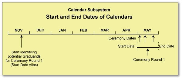 For example, in the Graduation Subsystem it is recommended that a Calendar Instance be set up to indicate the period during which Graduation Ceremonies are actually held (Ceremony Round 1 in this case). The Start and End Dates of this period have no specific functionality associated with them, and serve only to define the particular instance of Ceremony Round 1. Specific Date Alias Instances are attached to this Calendar to provide functionality, such as the date on which identification of potential Graduands for the Ceremony period can start (Start Date Alias Instance) or the three dates on which ceremonies will be held.