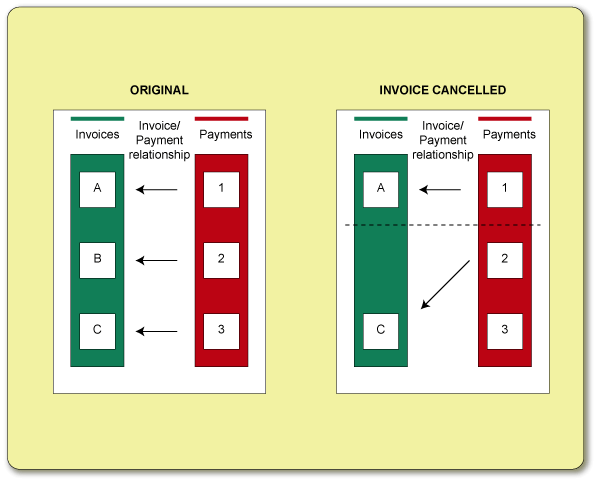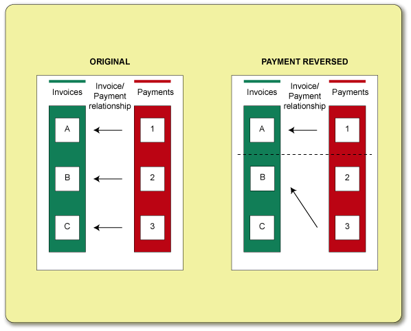 Payment 2 has been reversed (perhaps because a cheque has not been honoured) and therefore the next payment received (3) is now applied to invoice B, which is due earlier, or ranks higher, than invoice C. A debt still exists for invoice C.