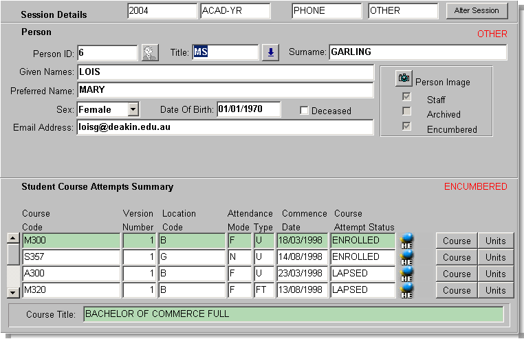 Further information regarding query methods can be found under Query Process in the System Overview. A Find Person facility can be invoked from the form to perform more complex queries. If an image for the Student is available through Callista, use the Person Image icon to access this. The system will attempt to derive an Enrolment Category from the Student's Course Attempts. If this differs from the Enrolment Category (where specified) in the Session Details, the System will combine the features of both categories. The Enrolment Category being used for this Student is displayed in red text in the top right hand corner of the block. This Enrolment Category will be used in determining the configuration of the Person block. Users