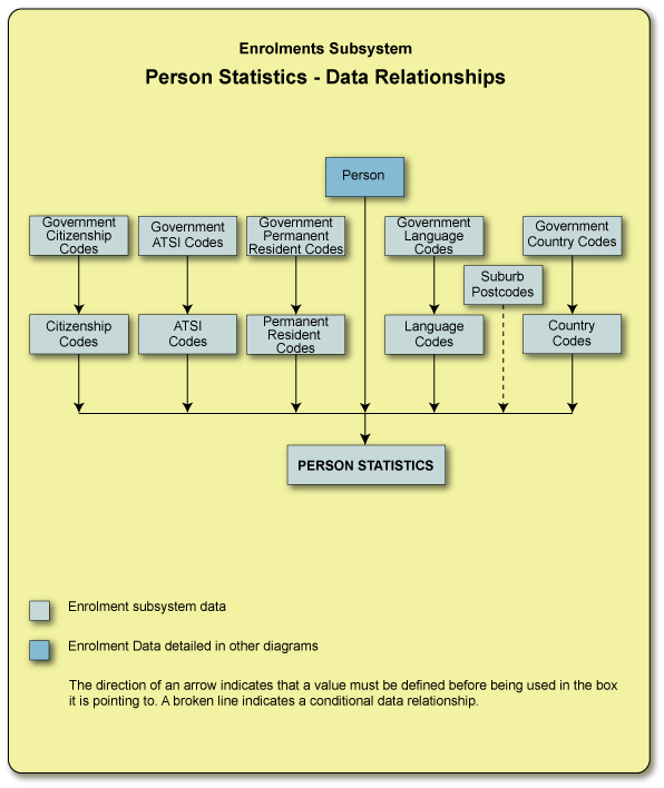 The Person Statistics diagram shows that the majority of statistical data recorded against a student is in the form of predefined codes. Most of these codes, in turn, map to Government specified codes which are used to report student statistical information to government. These codes are reference data and must be set up prior to the recording of student statistics.