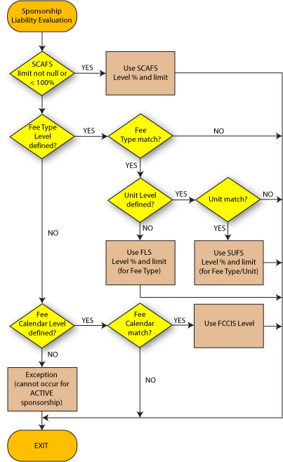If the SCAFS level sponsorship limit is null and percentage contribution is 100% (i.e. the default values), the sponsorship limit/percentage contribution at the lowest levels at which data is entered are used and the sponsorship limit and percentage contribution at other levels are ignored. For example: