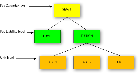 Note that there may be more than one ‘lowest level’, for example if two fee types TUITION and SERVICE are specified, and units are specified for the TUITION fee type, then the lowest level is the unit level for TUITION fees and fee type level for SERVICE fees. This is illustrated in the following diagram:
