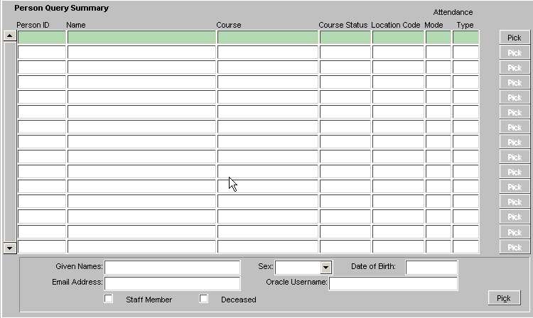 'Pick' button. The Person Inquiry screen is redisplayed and contains data
