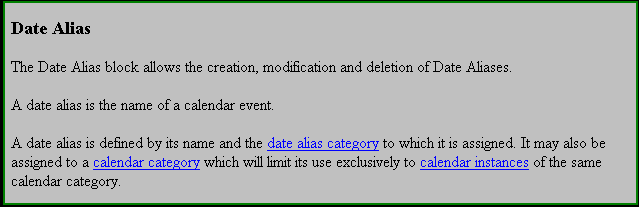 The text which is underlined and coloured blue, such as 'calendar category ', are hypertext links. In this case, clicking with the mouse on any part of the text will immediately display the definition for calendar category.