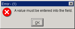 Errors are notified by a pop-up alert which signifies that an error has occurred. They are identified by 'Error' in the form title bar and a large red stop sign.