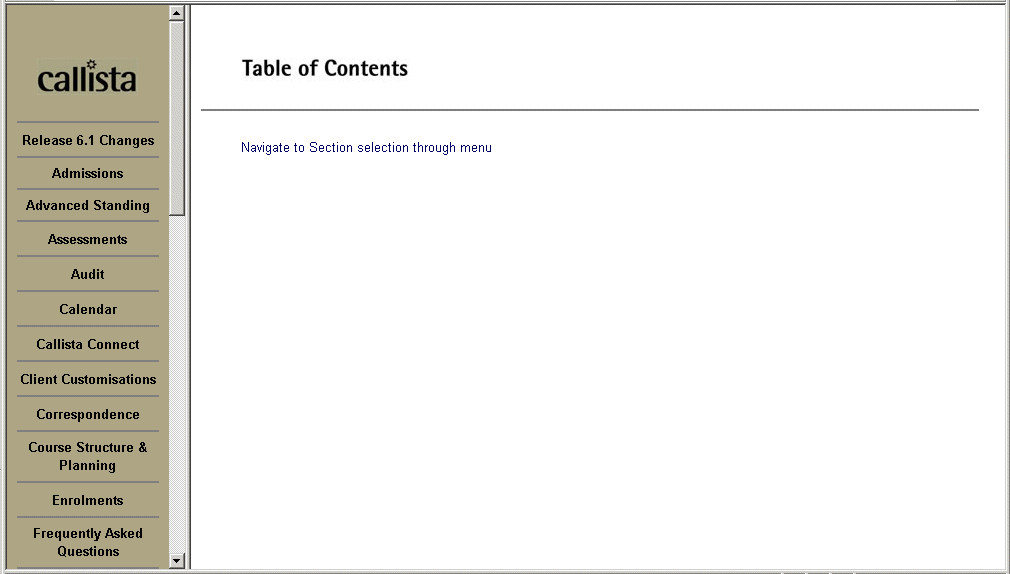 Each of the entries shown underlined in the picture above is a hypertext link to the relevant part of the manual. For example, to see information about Government Course Types select the Table of Contents entry Course Structure and Planning from the left column and Maintain Government Course Types from the right column. Having visited the Table of Contents it is easy to return to it by either clicking on the Back button on the browser toolbar or clicking on the Table of Contents hypertext link at the top of the displayed page.