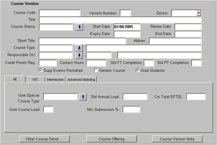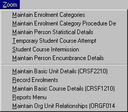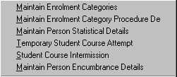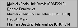 You will often come across forms in which menus, fields and buttons are 'greyed out', that is, they appear as a fainter, lighter grey. Greyed out parts of a form indicate that use of that part of the form is unavailable to you at that time. In the case of menus, this usually means that you do not have the necessary security permissions to access the part of the System indicated by the menu option. In the case of fields, use may be restricted because the field is not accessable in the mode in which you are operating or because of a restriction on access to data. In the case of navigation buttons, it means that this navigation option is not available. Fig. 1.17 contains a number of fields which are 'greyed', including Title and Course Status. In this case the fields are unable to be updated within the form. Fig. 1.27 shows 'greyed' menu items CUT and COPY in the EDIT menu, signifying that the cut and copy options are not currently available.