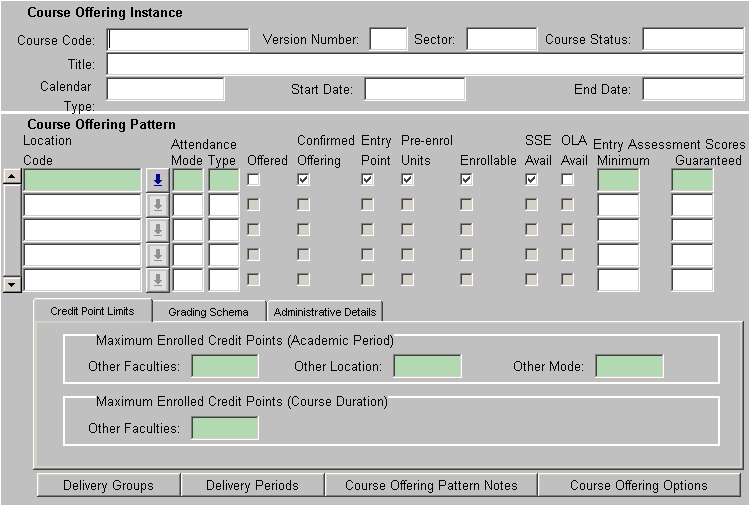 The boxed area at the bottom of the form containing the Maximum Cross Credit Points information is additional data from the selected Course Offering Pattern record. Selecting a different Course Offering Pattern will cause the Maximum Cross Credit Points information for that record to be displayed.