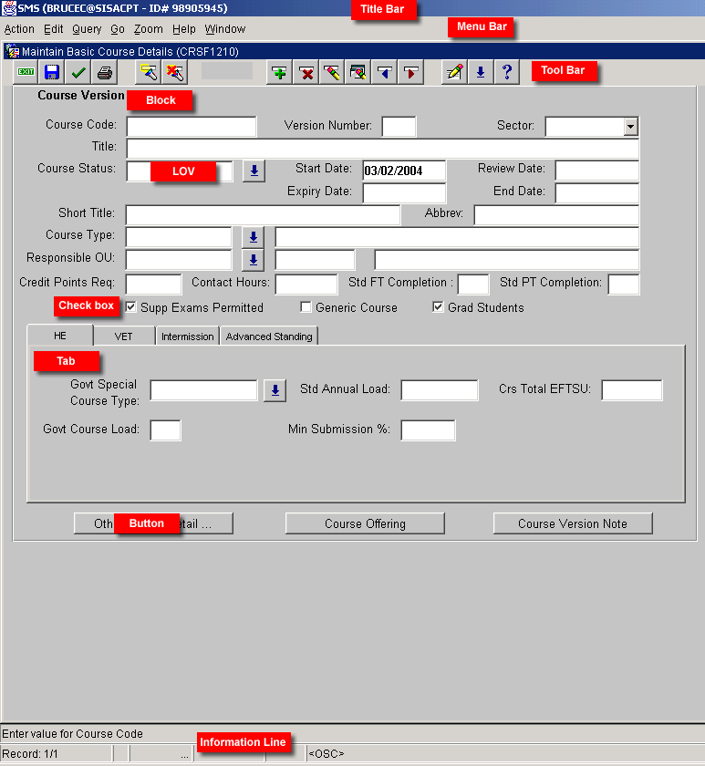 Forms are the mechanism by which you access the functionality of the System. They are what you see on the screen and are defined by Oracle as 'a group of related blocks'. They are used to manage the flow of data into and out of the System and to control much of the activity within the System. Pictured below (fig. 1.12) is a typical SIS form with its major components labelled.