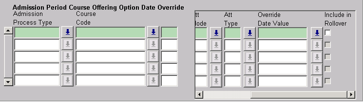 In this form, the Course Offering Pattern block contains multiple records. At the bottom of the form is a boxed area devoted to cross credit point information. Such areas are known as overflow areas. Note that the overflow area contains data only for the record selected (shaded) in the Course Offering Pattern block.