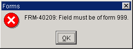 Field formats are displayed in the Field Help form for each field. This specifies the type and length of field. An easier option for determining the format of a field is to enter data in a field; if the format is incorrect a message such as those shown above will display on the screen specifying the correct format.