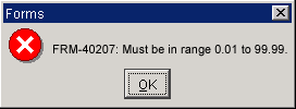 Some fields have very specific formatting which limits the entry of data to a set of values. For example, a number field may be formatted to accept only numbers of the form 99.999. This means that only values falling between 0.001 and 99.999 may be entered. (fig. 1.18)