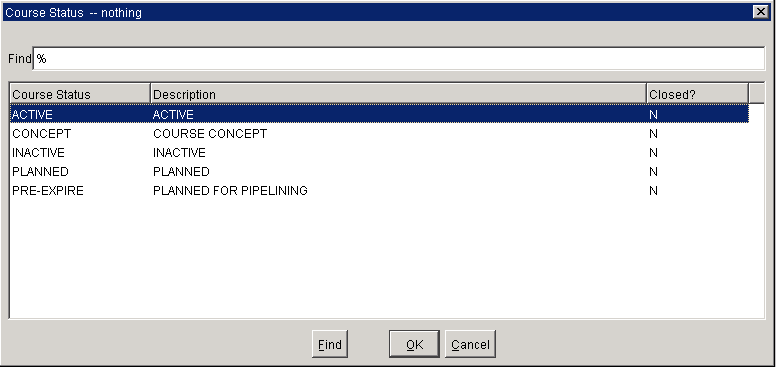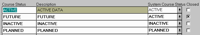 Fig. 1.34 illustrates a typical use of a closed check box. The course status FUTURE has been closed. It is no longer available to be used in the definition of courses. The other course statuses are all available for use.