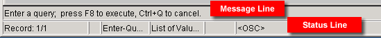 The message line may display Oracle Forms messages, such as instruction, error and warning messages for standard Oracle operations. For instance, if you try to scroll to the next record when all the records related to the current query have been displayed, Oracle Forms displays the message, "FRM-40352: Last record of query retrieved". In fig 1.23, the message line is providing instructions for using the current mode (in this case Query mode).