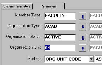 Report/Job Parameters are similar to query criteria. The user specifies data values to be used in a report's data extraction process with the result that only data matching the specified criteria is reported. A portion of a report parameter form is shown below. In this example, by specifying organisational unit 04, a report is produced containing only information related to this organisational unit.
