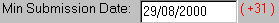 • A positive or negative number displays beside the Min Submission or Max Submission Date fields, indicating the difference between the system-calculated submission dates and an override date. Example: