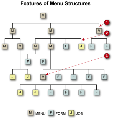 The same sub-menu, form or job can appear under more than one menu.