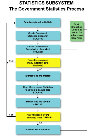Preparations for Government Statistics Submissions commences with the creation of an Enrolment Statistics Snapshot. This snapshot is produced as frequently as the institution requires (by running STAJ0100 in the Job Control and Scheduling subsystem) and can be used for pre-submission data checking (by utilising the Government Statistics Process to identify HEPCAT validation errors) or other institution purposes such as enrolment analysis.