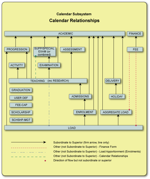 Teaching Calendars do not belong to a particular Subsystem. They are used to represent the Teaching Periods of the institution. Typically this will mean Semesters, trimesters or terms, although institutions may need Calendars for summer Semesters and other short non-standard Teaching Periods. For example, SEM-1 01/01/2006 30/06/2006 could be used to represent Semester 1, 2006. SUMMER 03/01/2007 20/02/2007 could represent a summer Semester in 2007. Note that two or more Teaching Periods can run concurrently.