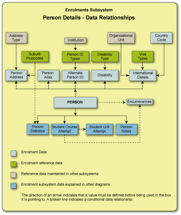 The Person Details diagram above shows the main data relationships relating to a person record. The Enrolments Subsystem is concerned with a particular group of person records-those of students. Each student is identified by a standard set of data including an Identification Number, Surname and Given Names and Birth Date. The System also allows you to record additional personal data for a student such as Alternative Names, Disability details and Visa details for international students. In order to record some of this personal data, reference data must first exist. The reference data is then used in the definition of the personal information.