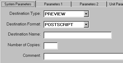 System Parameters determine how a report will be run and the nature of the output produced. The system parameters are similar on all parameter forms and are shown below.