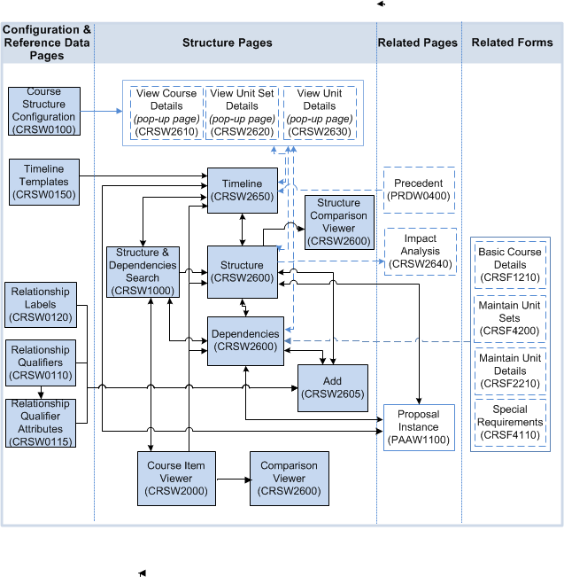 Structures and Dependencies can be created and modified in the CRS subsystem for a curriculum item; or (if your institution has Proposals (PAA) installed) in a Proposal instance, where access to the Structure and Dependencies (CRSW2600) page is provided via the Proposal (PAAW1100). (For more information, see Structures and Dependencies in Proposals.)