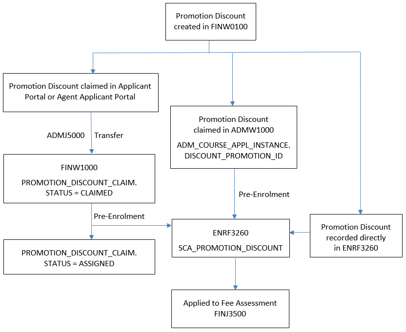 During pre-enrolment, if a PROMO ID is recorded for the student in ADMW1000 then this discount will be applied and a corresponding SCA Promotion Discount record will be created in the SCA_PROMOTION_DISCOUNT table. This can be viewed in ENRF3260. If there is no Promo ID recorded for an applicant in ADMW1000, then a discount claimed via Applicant or Agent Applicant Portal will have its status changed to APPLIED and a corresponding SCA Promotion Discount record will be created.