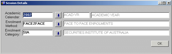 The Academic Calendar parameter ensures that the course and unit offering patterns displayed are for the correct academic period. The process category specified in the session details determines which navigation buttons, and hence which Direct Admission data maintenance screens, are displayed to the user. The process category is associated with all new admission applications processed during that session. Where an existing admission application is being added to or modified, the system recognises the admission process category of the application and overrides the session details for that application. Admission process categories and their steps are maintained via form ADMF2M30. |