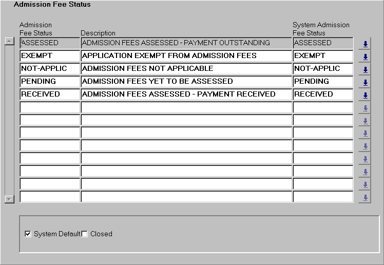 Use this form to record the institution defined codes for the status of an admission fee. These codes are used to indicate the current state of the admission application fee for an applicant, whether paid, outstanding etc. Status codes might include ASSESSED, EXEMPT, RECEIVED. The statuses maintained in this form are used within the Application block in Maintain Admission Course Application (ADMF3240) to indicate the state of activity of the student's application assessment fee. Each code must be mapped to a System admission fee status.It is recommended that the mapping of institution defined codes to System codes be a one-to-one relationship. It is also recommended that wherever practicable, System codes should also be used for institution defined codes. Where more than one institution defined status maps to a single System Status, one must be defined as the System default. When the System automatically applies a particular institution defined status to an admission application, the default is the one it applies. |