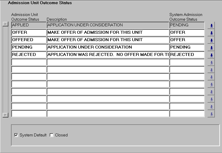 Use this form to record the institution defined codes for the status of an Admission Unit Outcome. These codes are used to indicate the status of an application for admission to a particular unit. Codes might include PENDING, OFFER, REJECTED. The data maintained in this form is used within the Admission Course Application Instance Unit block in the Direct Admissions Unit form (ADMF3250). Each code must be mapped to a System admission outcome status .It is recommended that the mapping of institution codes to System codes be a one-to-one relationship. It is also recommended that wherever practicable, System codes should also be used for the institution defined codes. Where more than one institution defined status maps to a single System Status, one must be defined as the System default. When the System automatically applies a particular institution defined status to an admission course application instance unit, the default is the one it applies. |