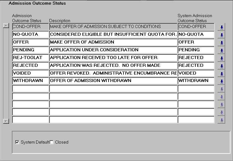 Use this form to record the institution defined codes for the status of an admission outcome. Codes might include OFFER, REJECTED, NO-QUOTA. These codes are used to indicate the outcome of an application for admission. The data maintained in this form is used within the Admission Course Application Instance block in Maintain Admission Course Application (ADMF3240). Each code must be mapped to a system admission outcome status.It is recommended that the mapping of institution codes to System codes be a one-to-one relationship. It is also recommended that wherever practicable, System codes should also be used for the institution defined codes. Where more than one institution defined status maps to a single System status, one must be defined as the System default. When the System automatically applies a particular institution defined status to an admission application, the default is the one it applies. |