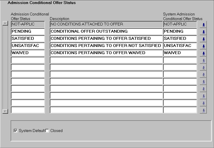To allow the recording of institution defined admission conditional offer status codes |