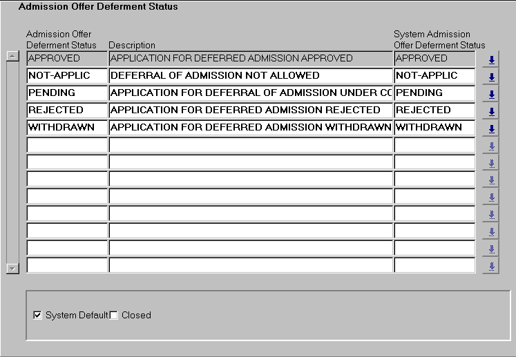Use this form to record the institution defined codes for the status of an admission offer deferment request. Statuses might include APPROVED, REJECTED, WITHDRAWN. These codes are used to indicate the state of a request for a deferral. The data maintained in this form is used via the T-list in Maintain Admission Course Application (ADMF3240). Each code must be mapped to a System admission offer deferment status.It is recommended that the mapping of institution codes to System codes be a one-to-one relationship. It is also recommended that wherever practicable, System codes should also be used for the institution defined codes. Where more than one institution defined status maps to a single System Status, one must be defined as the System default. When the System automatically applies a particular institution defined status to an admission deferment application, the default is the one it applies. |