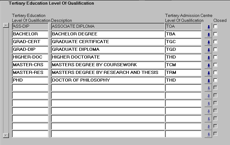 Use this form to record institution defined Tertiary Education Level of Qualification codes. These codes are used in ADMF32B0 (accessed via ADMF3000) to indicate the level of qualification attributed to an applicants previous tertiary education. Each code may optionally be mapped to a Tertiary Admission Centre (TAC) level of qualification (maintained in ADMF02U0). This permits data supplied by TAC to be converted into institution defined values for recording against an applicant.It is recommended that where the TAC supply this information, the mapping of institution codes to TAC codes be a one-to-one relationship. It is also recommended that wherever practicable, TAC codes should also be used for the institution defined codes. |