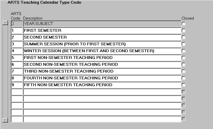 This form is used to record the Tertiary Admissions Centre calendar type codes. The codes are used in the Automated Record Transfer System (ARTS). ARTS teaching calendar type codes are mapped to institution defined teaching calendars in the Maintain Calendar Types form (CALF0220). Refer to the TAC Handbook for details on ARTS calendar codes. |
