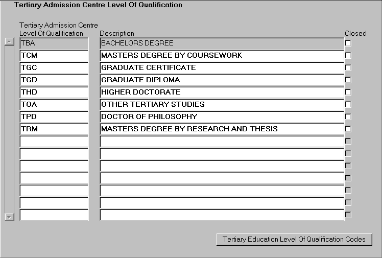 This form is used to record the Tertiary Admissions Centres codes that define the Level of Qualification an applicant has obtained. These codes are obtained from the relevant TAC manual/handbook. Institution defined level of qualification codes are mapped to these codes in ADMF02K0. When TAC offering data is loaded into Callista, the System records the level of qualification of the applicant's prior tertiary education. It is the institution value, derived from the TAC supplied code which is recorded against the student. The Tertiary Education Level of Qualification Codes navigation button invokes the Maintain Tertiary Education Level of Qualification form (ADMF02K0). Selecting a TAC code before navigating to ADMF02K0 causes only the institution defined codes mapped to this TAC code to be displayed in ADMF02K0. |