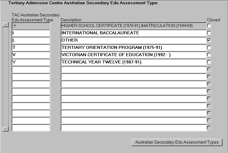 This form is used to record the Tertiary Admissions Centre codes for Australian Secondary Education Assessment Type. These codes are obtained from the relevant TAC manual/handbook. Institution defined Australian secondary education assessment type codes may optionally be mapped to these codes in ADMF02W0. When TAC offering data is loaded into Callista, the System records the secondary education asessment type of the applicant. It is the institution value, derived from the TAC supplied code which is recorded against the student. |