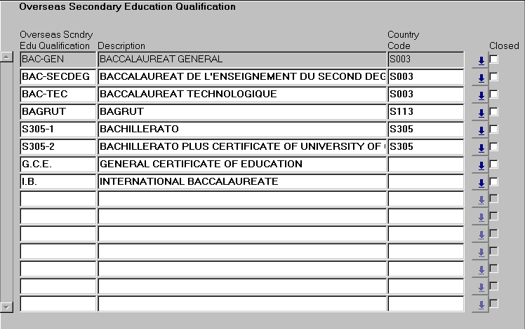Use this form to record the institution defined Overseas Secondary Education Qualification codes. These codes are used in ADMF32D0 (accessed via ADMF3000) to indicate the level of qualification attributed to an applicant's overseas secondary education. Each code may be optionally mapped to a country code. Mapping of overseas qualification codes to country codes restricts the qualifications displayed in the LOV in ADMF32D0 to those relevant to the country code recorded there. |