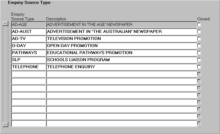 Use this form to record institution defined codes for enquiry source types. These codes are used to describe the source of a person's enquiry. For example: Newspaper Advertisement, School Liaison Activity. The data maintained in this form is used in the Enquiry Source Type LOV in the Record Admission Enquiry form (ADMF1200). |