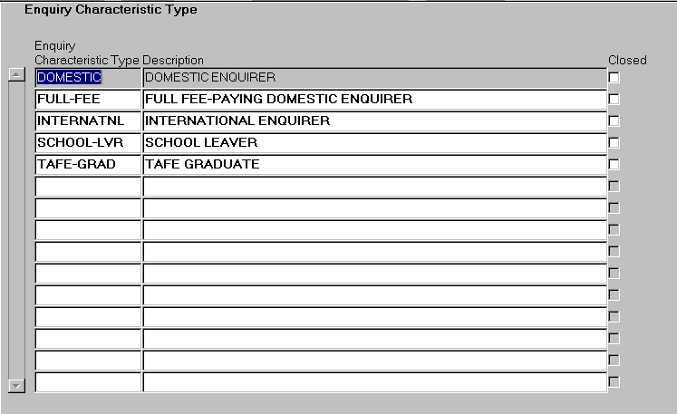 Use this form to record institution defined codes for enquiry characteristic types. These codes are used to describe the attributes of the applicant. For example: SCHOOL-LEAVER, MATURE-AGE, POSTGRADUATE. The data maintained in this form is used in the Enquiry Characteristic Type overlay displayed when the Characteristic button is selected in the Record Admission Enquiries form (ADMF1200). |