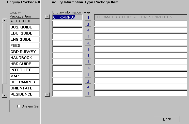 Enquiry package items can be retrieved by querying the system. This allows for the maintenance of package items. The data in this form is used to generate a list of enquiry package items according to the details recorded for an applicant in the Record Admission Enquiry form (ADMF1200). Package items are displayed by selecting the Package Item button in ADMF1200. |