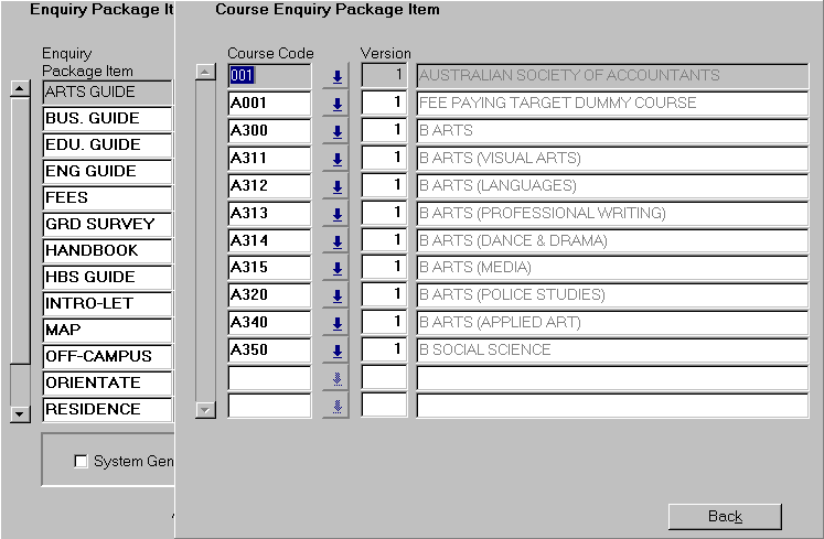 This form is used to create and maintain lists of enquiry package items for particular levels of enquiry. Enquiries can be general for the institution or specific for an organisational unit, discipline or course. For further details on recording admission enquiries refer to the Understanding Admissions overview. |
