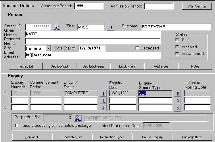 Maintain Tertiary Education Details form Maintain Australian Secondary Education Details form Maintain Overseas Secondary Education Details form Maintain Employment Details form Maintain Person Address Details form Maintain Person Notes form |