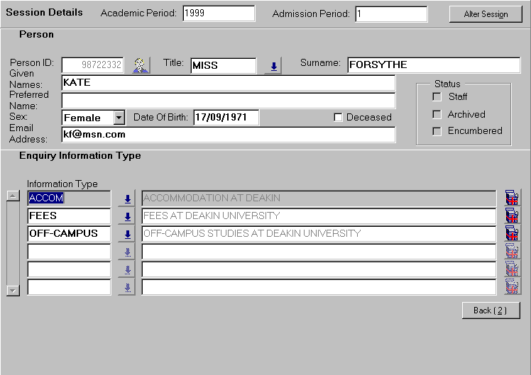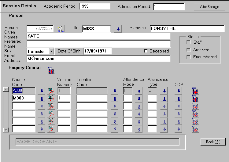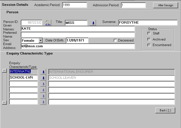 Session Details The session details screen is displayed on the first occasion on which a user accesses the record admission enquiry function. On subsequent occasions, the previously selected session details appear. The Session Details block is minimised and displayed along the top of the form. If it is necessary to change any of the preset details, selecting the Alter Session button maximises the facility. The session details screen is used to select: